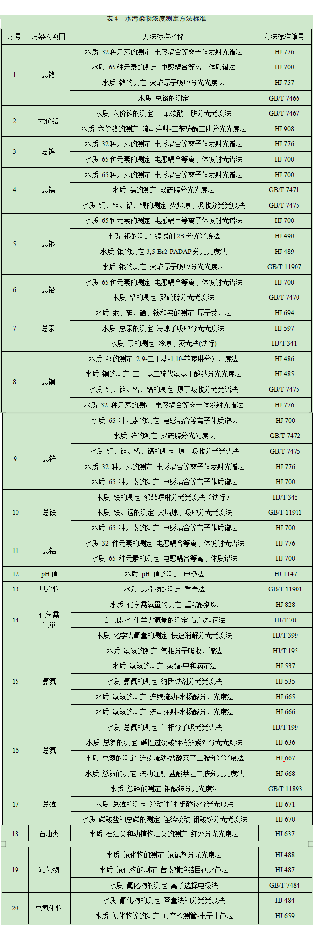對水污染物濃度的測定采用4表所列的方法標準或國家認定的其他等效方法標準。