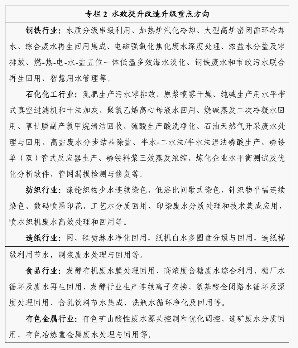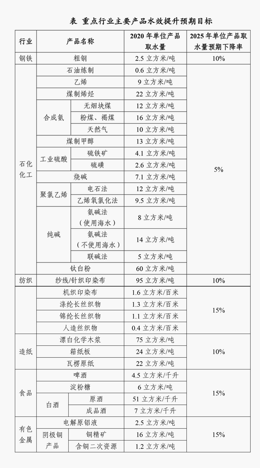重點用水行業水效進一步提升,鋼鐵行業噸鋼取水量、造紙行業主要產品單位取水量下降10%,石化化工行業主要產品單位取水量下降5%,紡織、食品、有色金屬行業主要產品單位取水量下降15%。