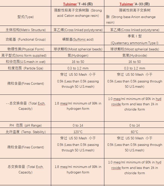Tulsimer? T-42 和 Tulsimer? A-23 其均勻的顆粒直徑,能取代傳統的離子交換樹脂,并可以減少壓力損,可以一起搭配使用于2B3T及超純水可再生的混床。