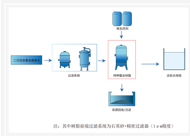 以重金屬廢水為例,針對特定重金屬離子的特點,科海思工業廢水處理解決方案,利用螯合樹脂(CH-90Na)的特種功能基團與重金屬離子形成絡合物的特性,從而實現重金屬離子的回收利用及深度去除。