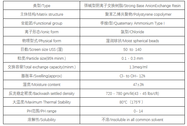 Tulsimer?A-853E是一款包含季胺I型官能團的聚苯乙烯架構的“堅韌膠凝體”強堿型陰離子交換樹脂,可以在較大的PH范圍和溫度條件下運行,并且再生效率高,主要應用在強酸和弱酸的去除。