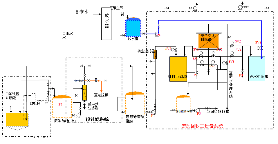 離子交換回收酸工藝是利用某些離子交換樹脂從廢酸溶液中吸收酸,排放金屬鹽的功能實現(xiàn)酸鹽分離的方法。