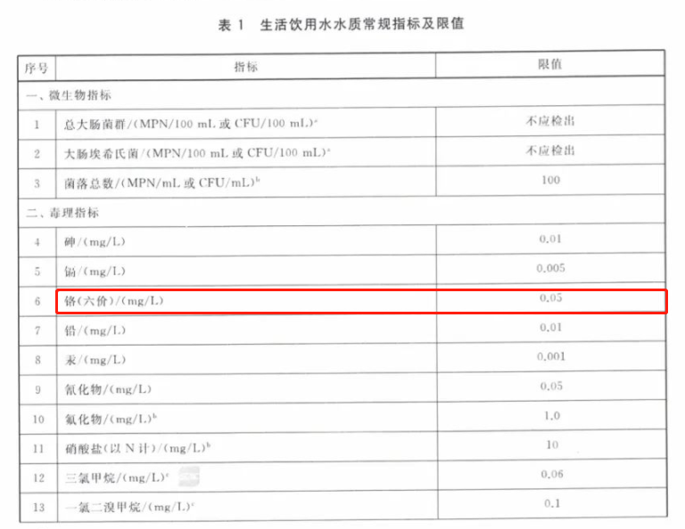 鉻在水中主要以三價(jià)和六價(jià)形式存在,三價(jià)的鉻是對(duì)人體有益的元素,而六價(jià)鉻是有毒的。由于其毒性之高,已被國(guó)家列入有毒有害水污染物名錄。人體長(zhǎng)期飲用含有六價(jià)鉻的水,六價(jià)鉻離子就會(huì)在體內(nèi)蓄積,對(duì)消化系統(tǒng)造成危害,影響正常的生理代謝,甚至?xí)?duì)肝臟、腎臟等重要器官造成損傷,形成不可逆的傷害。2023年4月1日正式實(shí)施的《生活飲用水衛(wèi)生標(biāo)準(zhǔn)》(GB5749-2022)中規(guī)定了生活飲用水中的六價(jià)鉻限值為0.05mg/L。